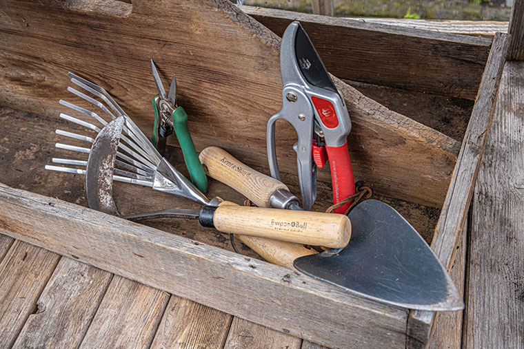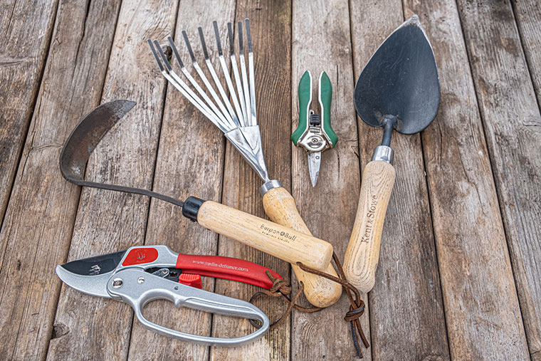 The razor hoe effortlessly cuts through the soil and lifts the weeds. The little hand rake (which is designed to pull leaves from beneath shrubs), then pulls the weeds toward me. The pointed trowel is great for digging smaller planting holes in my clay soil. The ratchet secateurs make it so much easier for me to prune. The snips are with me constantly, for deadheading, cutting fine stems, cutting flowers and more. They’re small, they suit my hand size. I do use other tools, but those five are my favourites and the most used.