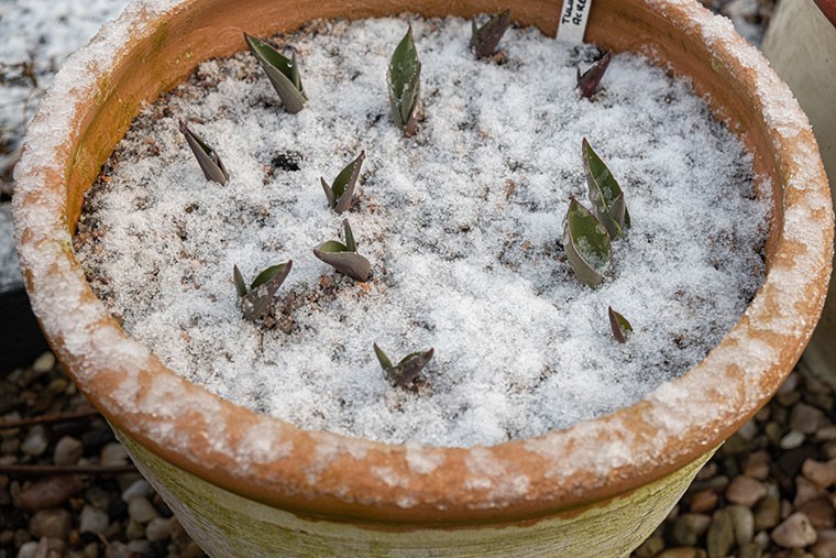 We had snow on Wednesday night, followed by some rain, and then it froze. By early morning it had gone from the grass, shrubs and most planting. But some remained in the pots around the garden, and I was out before breakfast, camera in hand, and wearing umpteen layers of clothing. It was slippy underfoot, but here’s a little visual summary of what’s springing into life at the end of February.