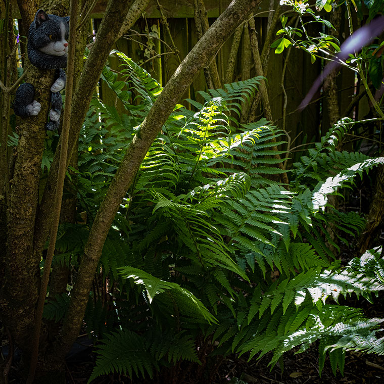 Inside the area there’s a few smallish ferns and hostas, but when I went in there a few weeks ago to add the little tree hugger, I spotted this lovely fern, happily growing in dappled shade.