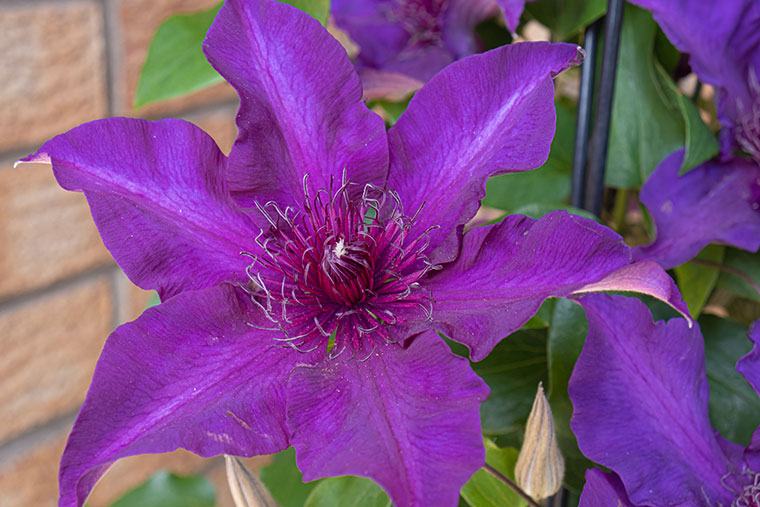 This is a small clematis, only 4ft in height, and a recent purchase. It sits in a container at the front door, beside the pots of pelargoniums. I wasn’t sure about the dark purple & magenta colour of the flowers when it started to bloom shortly after delivery in April, but it’s growing on me.