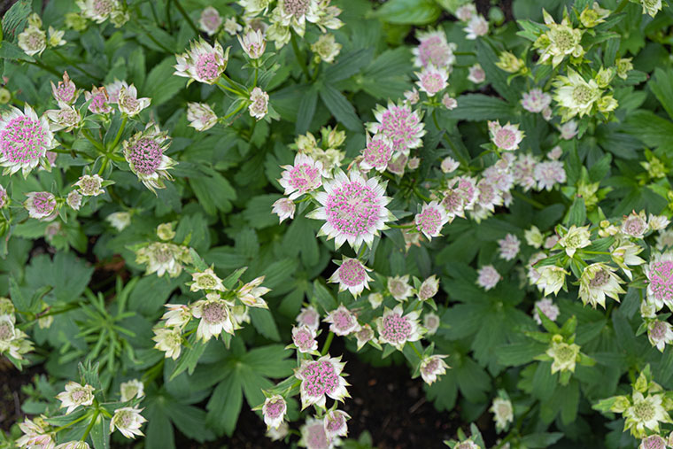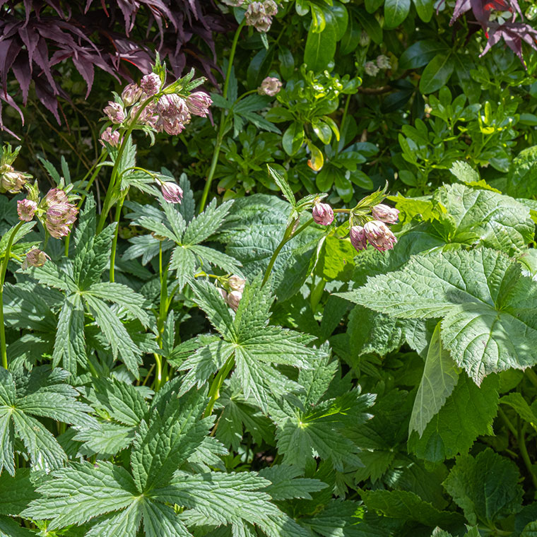 Four Astrantia ‘Buckland’ plants border one side of our raised patio so I can look straight down onto the tops of the almost-1m high flowers. Astrantia ‘Buckland’ blooms a little bit earlier than some of the other astrantias in the garden and its soft pink flowers are very attractive sitting on silvery-white bracts.