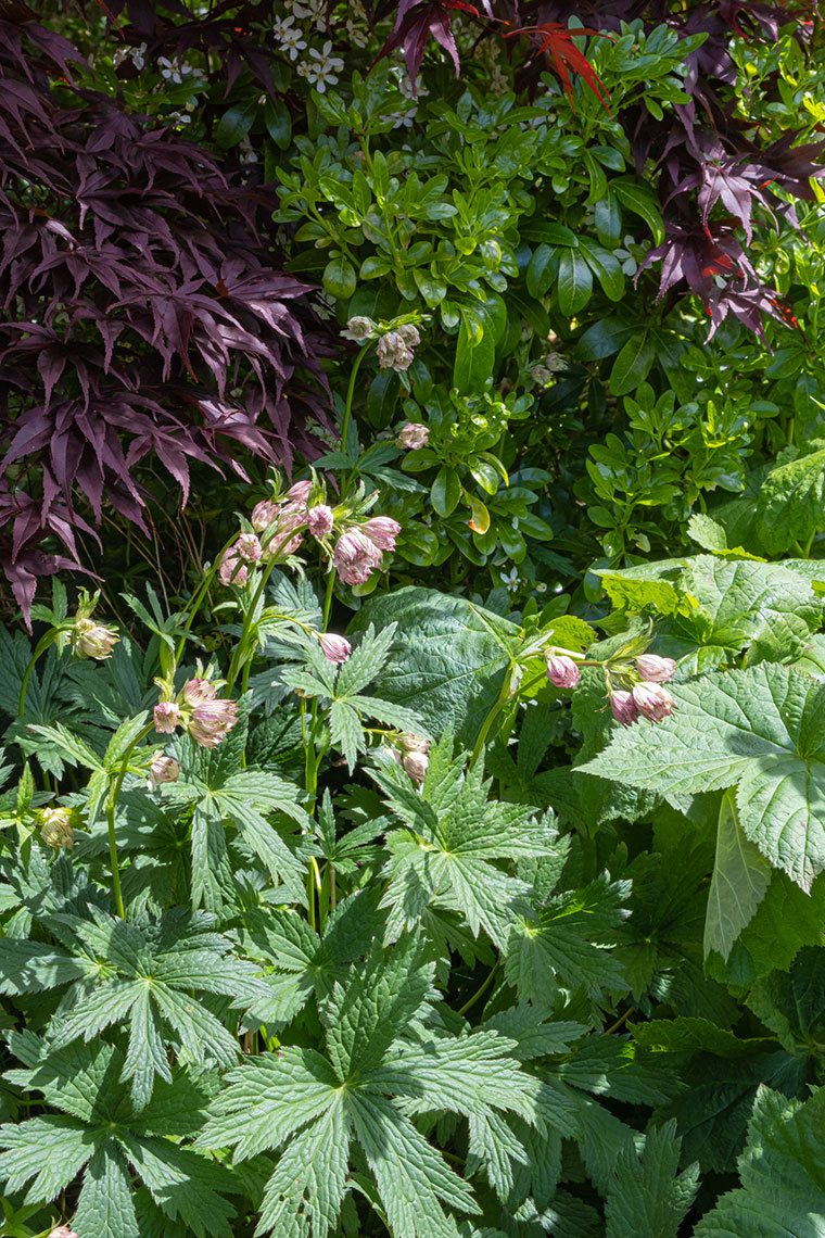 I was on my knees weeding during the week when I looked up and noticed this astrantia that grows in a fairly secluded spot. It’s nodding heads are just getting ready to stretch up and open to reveal its tall, delicate flowers that are in stark contrast to its surrounding neighbours.