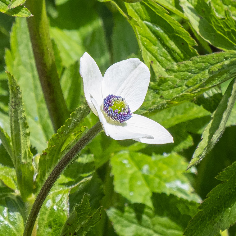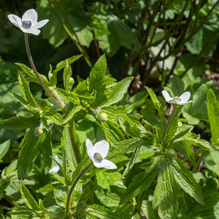 “Anemone rivularis, commonly know as ‘riverside windflower’ is a clump-forming cultivar. It has saucer-shaped white flowers, indigo in the middle and tinged blue on the reverse.”