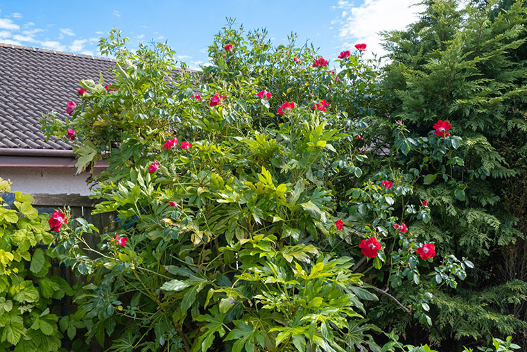 But to shorten all the in-between details, this rose has grown taller than all the plants that have grown around it, completely hiding its base. It grows through two conifers and a fatsia, and for years hasn’t been fed or pruned because there’s no access to it. But it flowers prolifically every year, and I’m kind of glad about the mistake that made it end up where it is today.