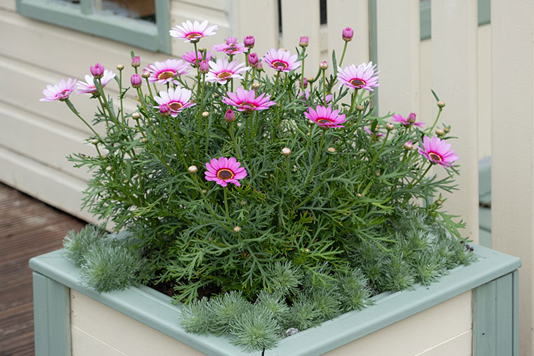 The collection was made up of five Argyranthemum frutescens ‘Grandaisy Pink Halo’ and five Artemisia schmidtiana ‘Nana Attraction’. I’ve grown Artemisia schmidtiana ‘Nana Attraction’ in the garden in previous years, but it doesn’t survive winters here. I think I’ll lift the plants and try overwintering them in the greenhouse this year.
