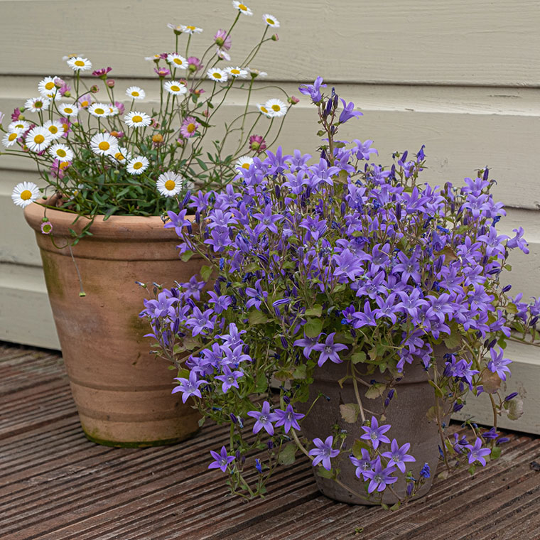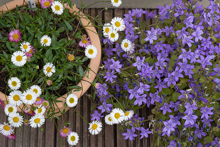 Campanula portenschlagiana and Erigeron karvinskianus were grown from seed in 2019 and two little 9cm pots were left behind in the planting process, languishing behind the greenhouse throughout the worst of our very wet winter.