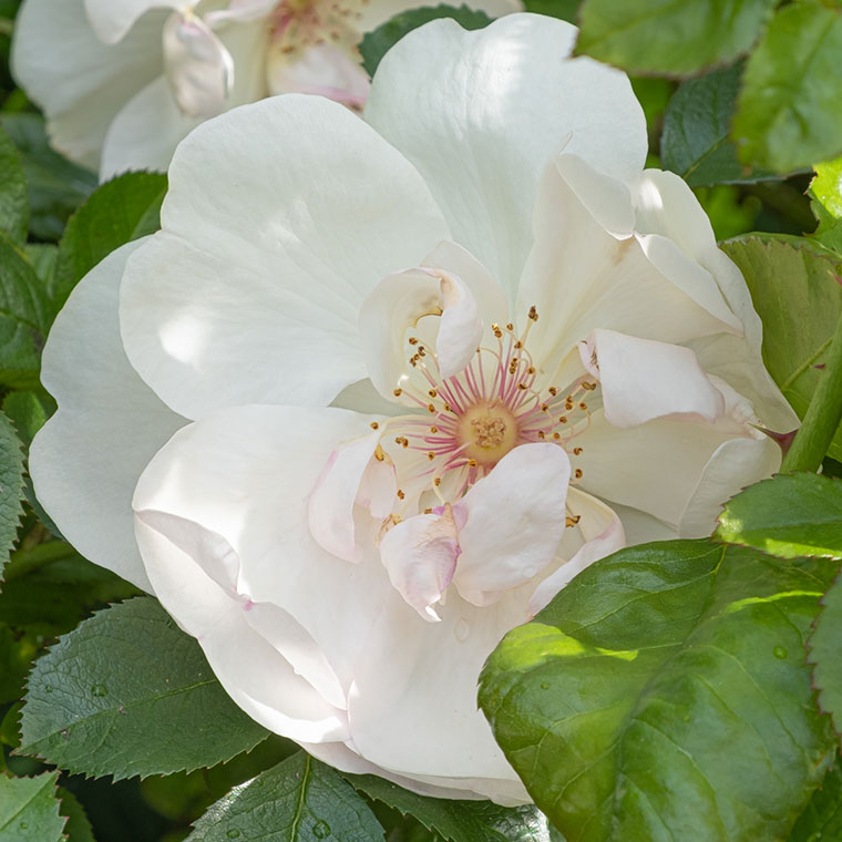 This is not a beautiful photograph of Rosa ‘Jacqueline du Pré’. This is a beautiful rose that I’ve had for many years, but now she has been surrounded by other, taller, roses, and access to her is almost impossible. This bloom was fading and the shot was taken by pushing the camera through the planting and hoping for the best – and by that I mean I was hoping I wouldn’t scratch the lens! I’ve made a note to lift her next year and find a new spot in the border where she can shine.