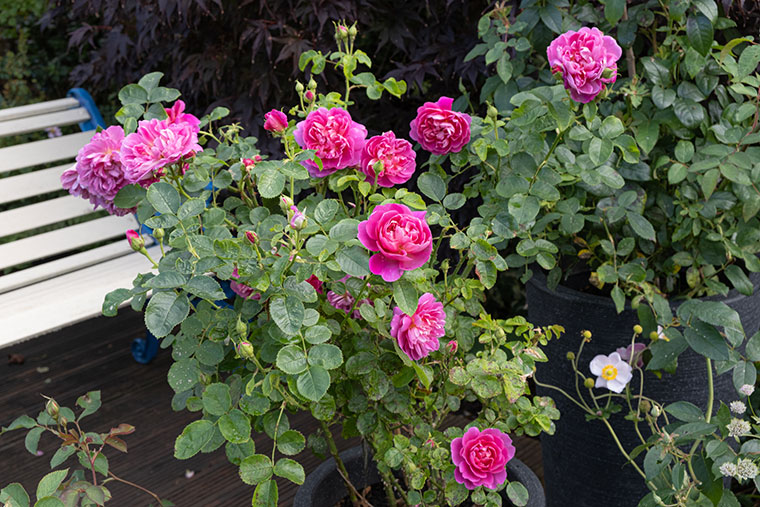 This rose is another that caught my eye this week. Gorgeous Rosa ‘Princess Anne’ is still in a pot, but I’ll have to move her to a border early next year as she’s getting quite tall. Her current location is in one of the more sheltered, sunny spots in the garden and I’m fairly sure that helps to account for the number of flowers and buds she is carrying.