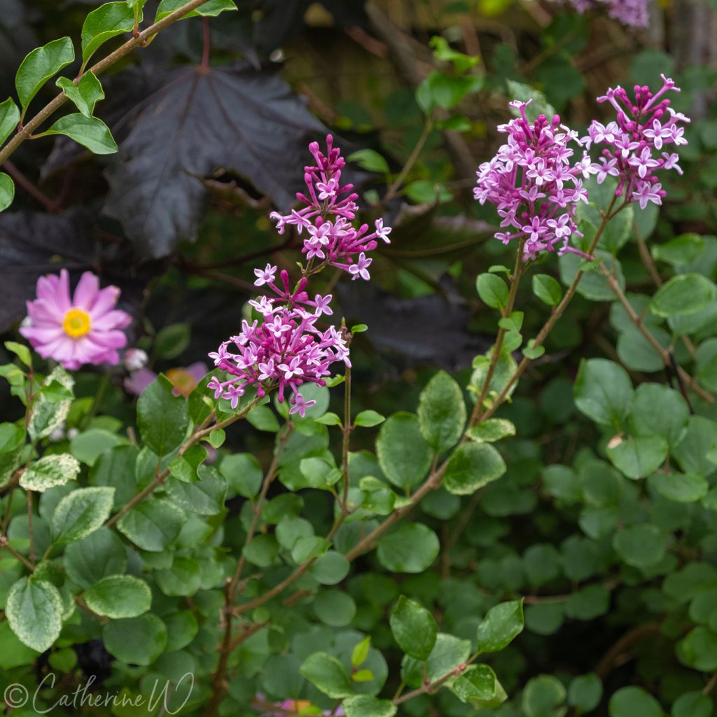 Syringa ‘Red Pixie’. I spotted this Lilac making a welcome second appearance yesterday. It’s not very floriferous, but nevertheless, it’s very welcome. It has timed its appearance perfectly to coincide with that of the Japanese anemone in the background. Now, if I could just get that anemone to grow a little taller instead of lurking in the shadows.