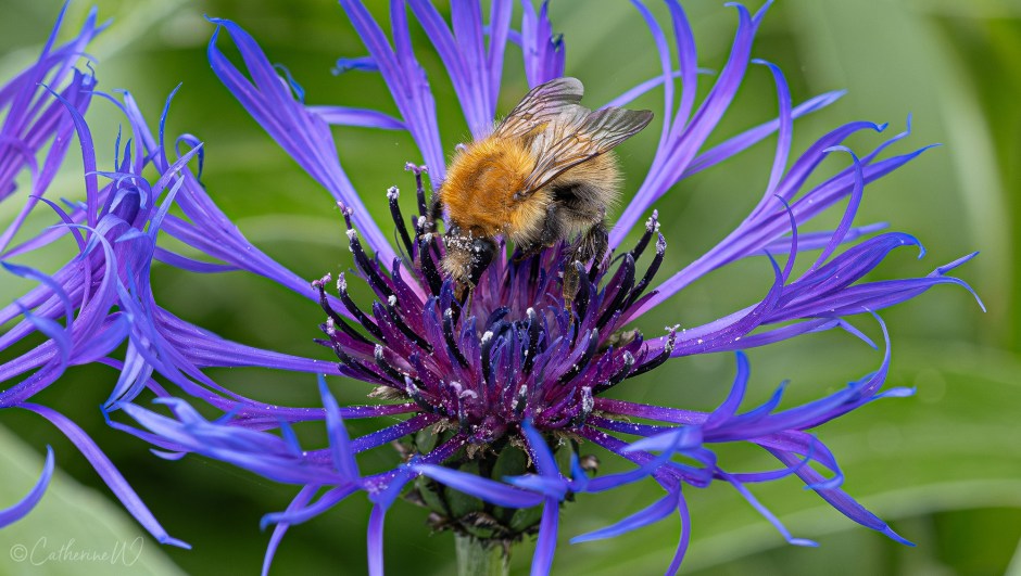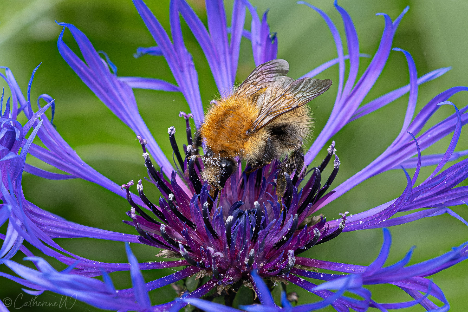 Centaurea montana. The pollinators arrived as soon as the flowers opened. This little creature was having a ball delving in among all that lovely pollen.