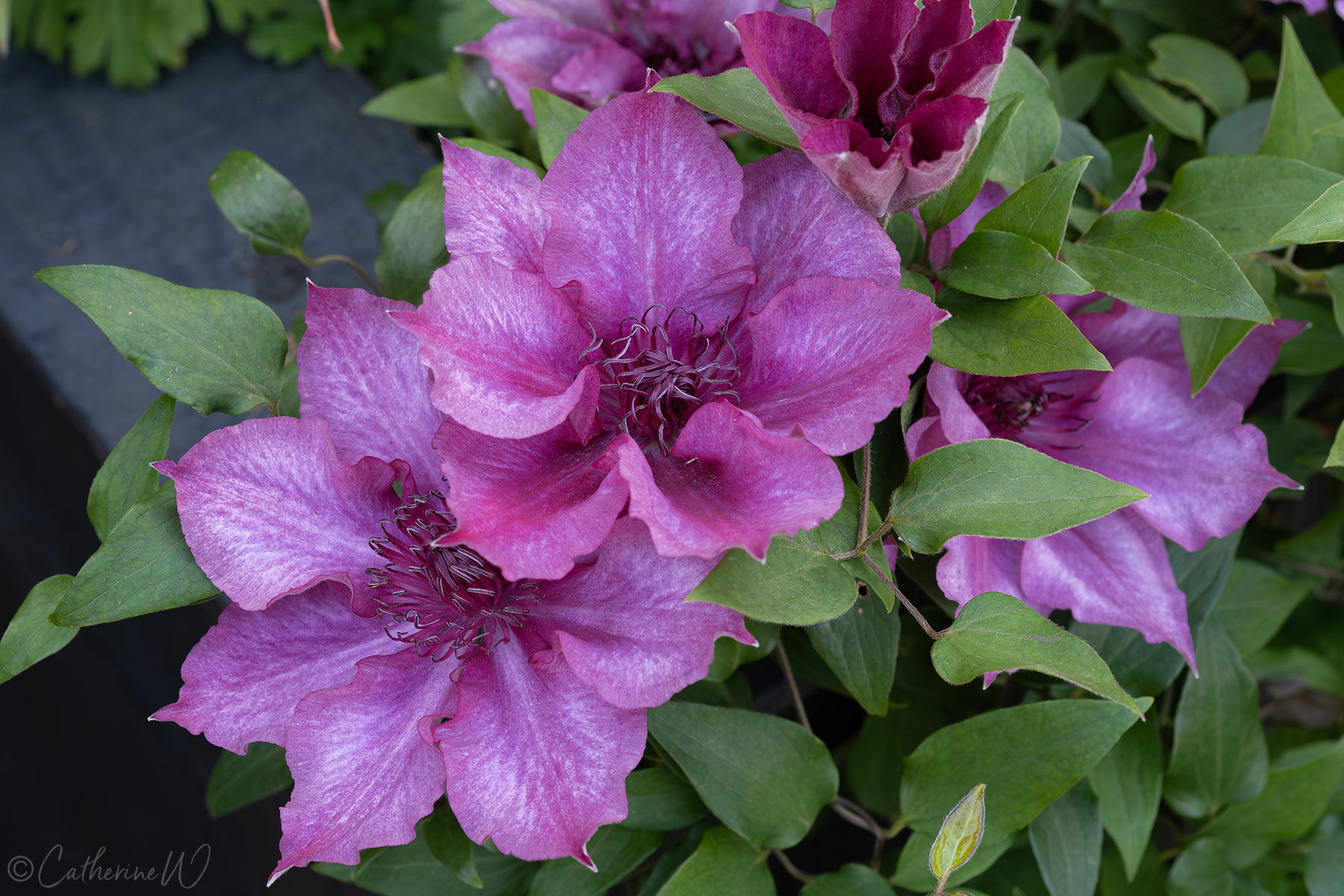 Clematis ‘Luiza’. From the Raymond Evison ‘Tudor Patio’ range, ‘Luiza’ is a very compact variety, growing to around 45 cm (18″). Two plants are trailing over either side of the large planter on my patio and both have been flowering for a few weeks. It’s a great choice for a small area or a container.