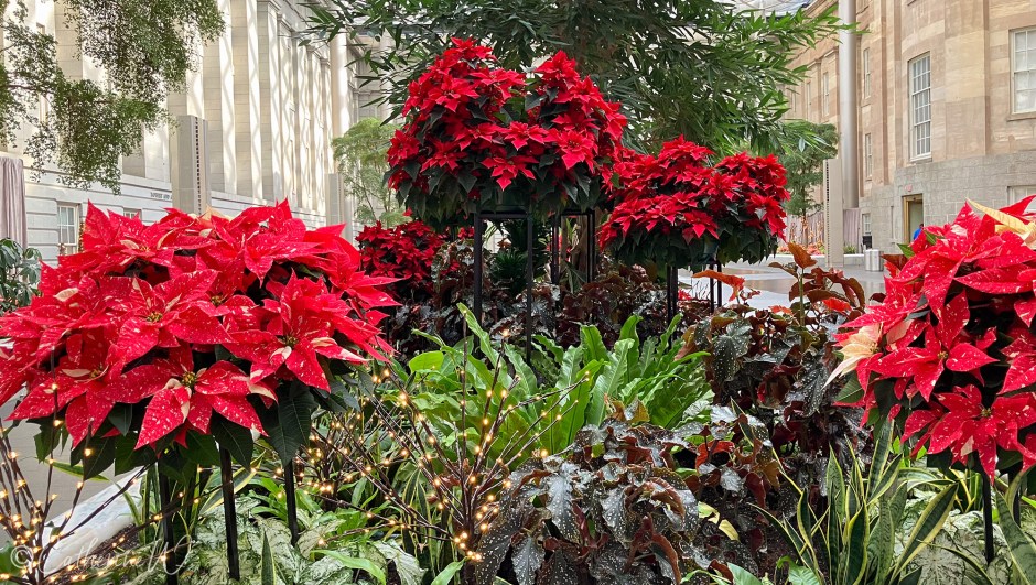 I really loved the Poinsettias on the raised stands! I like how the metal stands blend into the background, with Poinsettias repeated around them. It started me wondering if I could do something similar in one of my garden beds. Getting the planting right would be the main challenge. It’s something I’ll give some thought to, but I wonder if it could possibly work, or would they be too top-heavy and blow over in the wind?