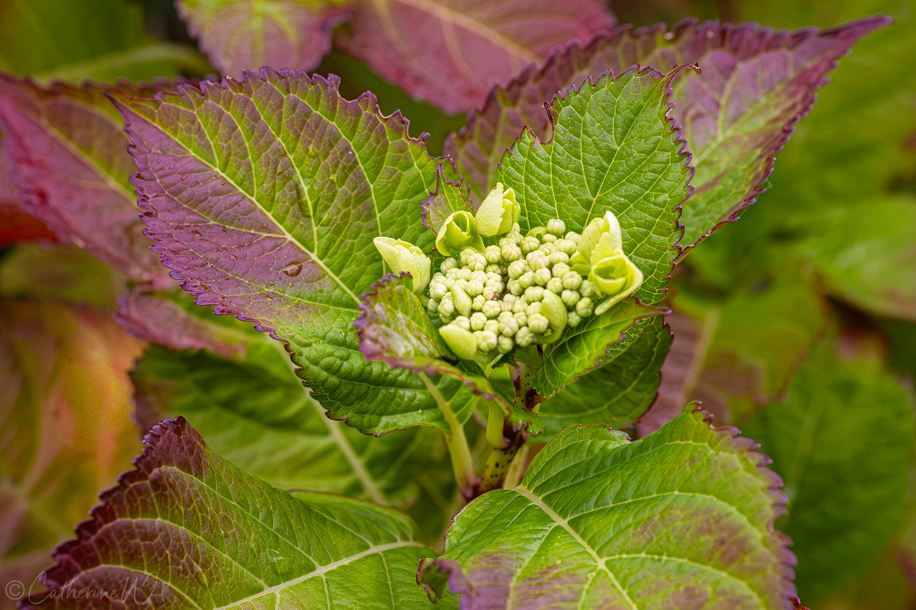 very pretty colours, red and green of autumn. And amazing this hydrangea which is poking its nose out and which wants to bloom again!